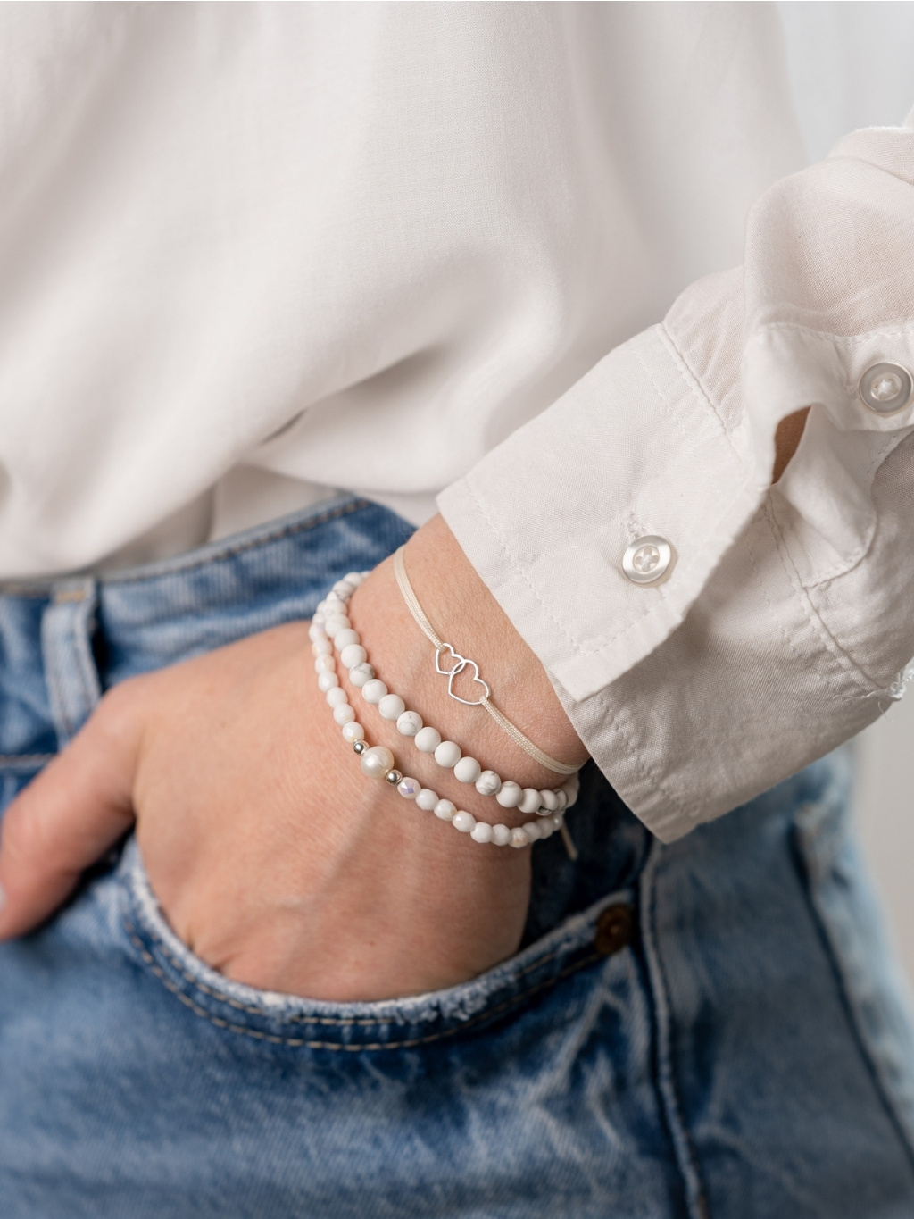 Složení: říční perla, skleněné mléčné broušené korálky, kuličky (stříbro Ag 925/1000)