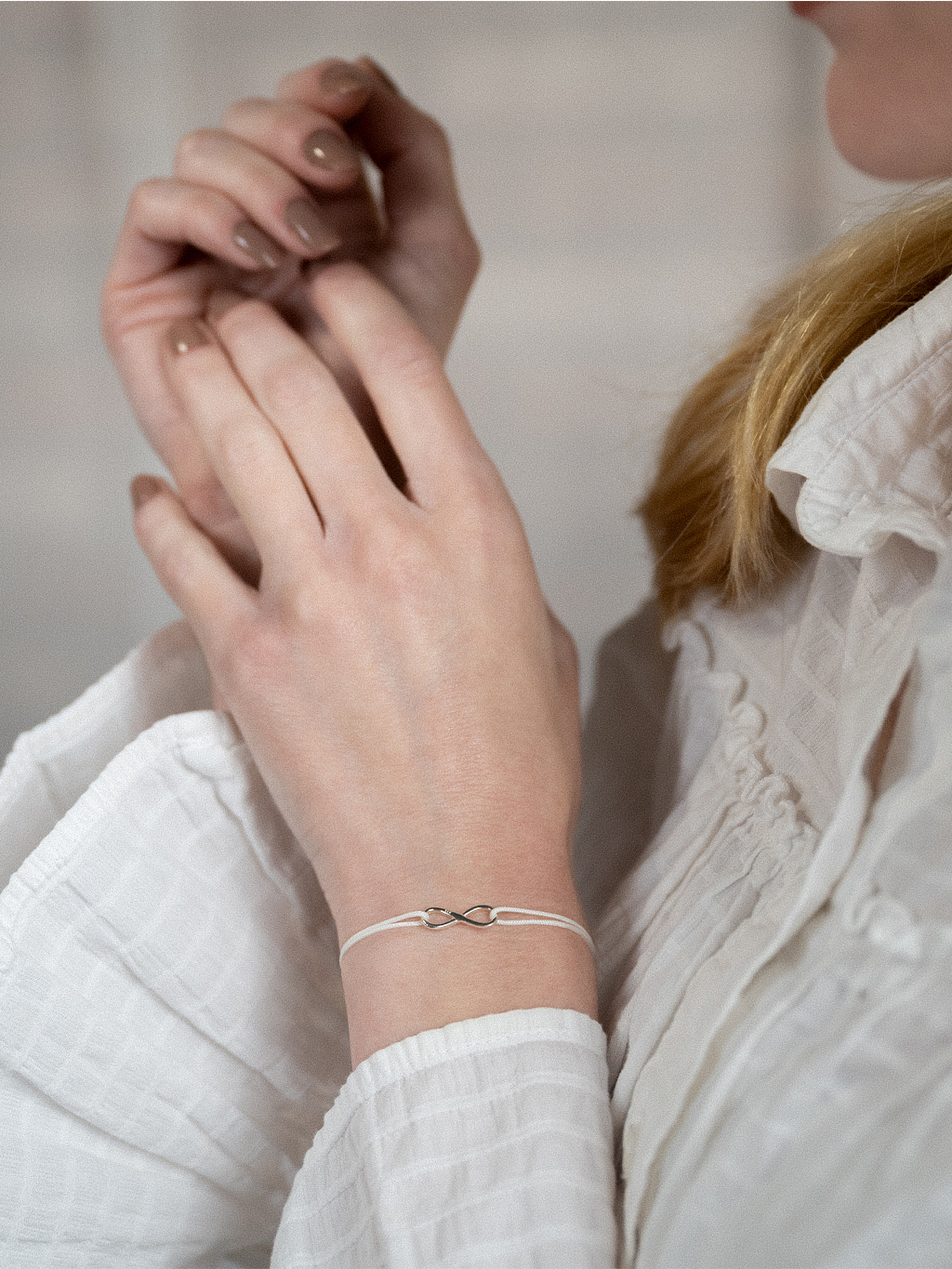 Složení: komponent stříbro Ag 925/1000, navlečeno na 1 mm nylonovém provázku, provázek je posuvný pomocí dvou uzlíků, velikost náramku lze libovolně upravovat.